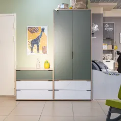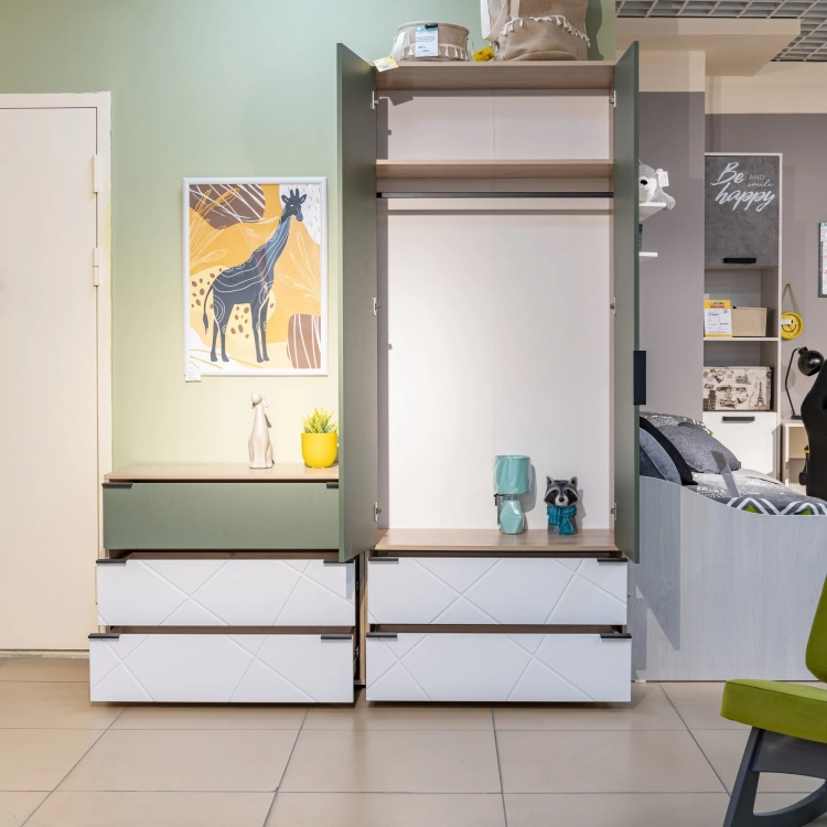 Шкаф для одежды комбинированный Лео (арт. ТД-410.07.22) из коллекции детской мебели — это идеальное решение для современной детской комнаты. Цветовая гамма включает в себя Гикори джексон, Белый матовый и Дымчатый зеленый, что придает шкафу яркий и стильный вид. Шкаф имеет две двери, за которыми расположена полка, два выдвижных ящика и штанга для вешалок. Это обеспечивает достаточно места для удобного хранения одежды и различных аксессуаров. Материал фасада и корпуса — ЛДСП, что делает конструкцию прочной и долговечной. Современный дизайн и функциональность этого шкафа идеально дополняют другие элементы детской комнаты из коллекции Лео. Все модули этой серии прекрасно сочетаются между собой и позволяют создать стильное и уютное пространство для вашего ребенка.