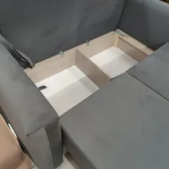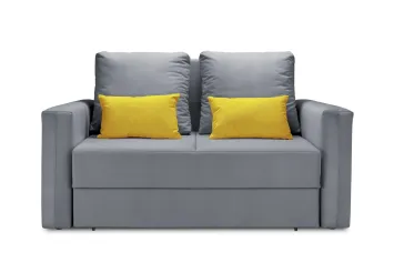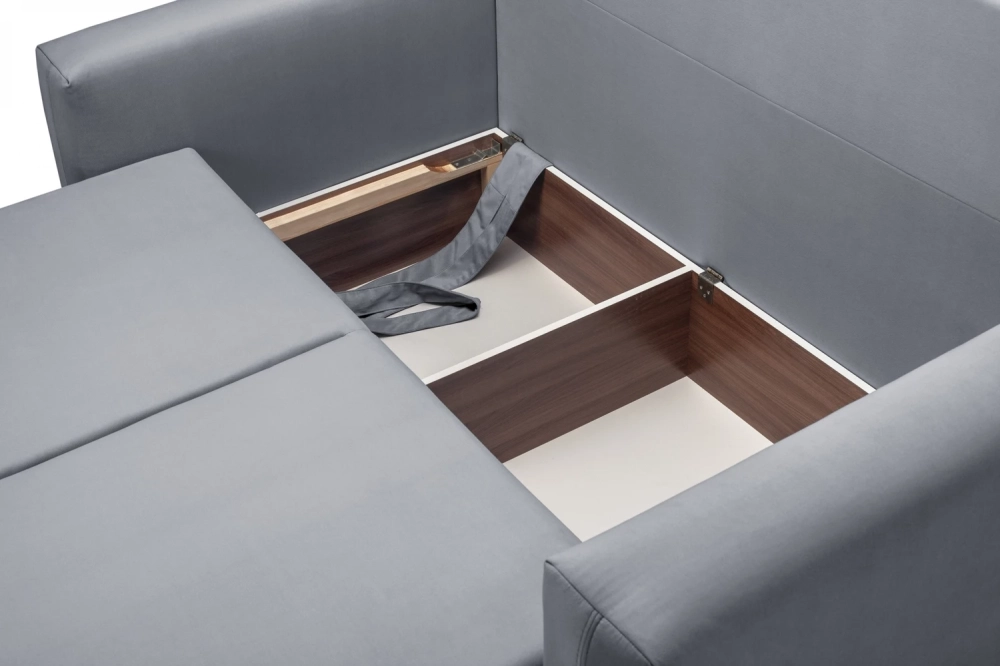 Диван дополнен подлокотниками и двумя большими и двумя маленькими подушками, обеспечивающими дополнительное удобство. Также в конструкции предусмотрен ящик для белья, что добавляет практичности и помогает экономить пространство.