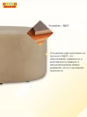 Основание пуфа выполнено из прочного ЛДСП, что обеспечивает надежность и долговечность изделия, а мягкая велюровая обивка добавляет уюта и тактильной приятности. Альба 800 прекрасно впишется в интерьер, оформленный в любом стиле, особенно если акцент делается на комфорт и изысканность.