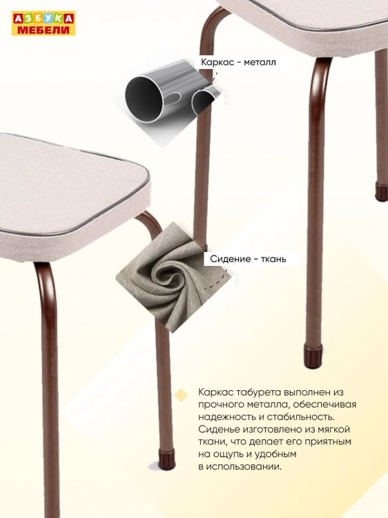 Каркас табурета выполнен из прочного металла, обеспечивая надежность и стабильность. Сиденье изготовлено из мягкой ткани, что делает его приятным на ощупь и удобным в использовании.